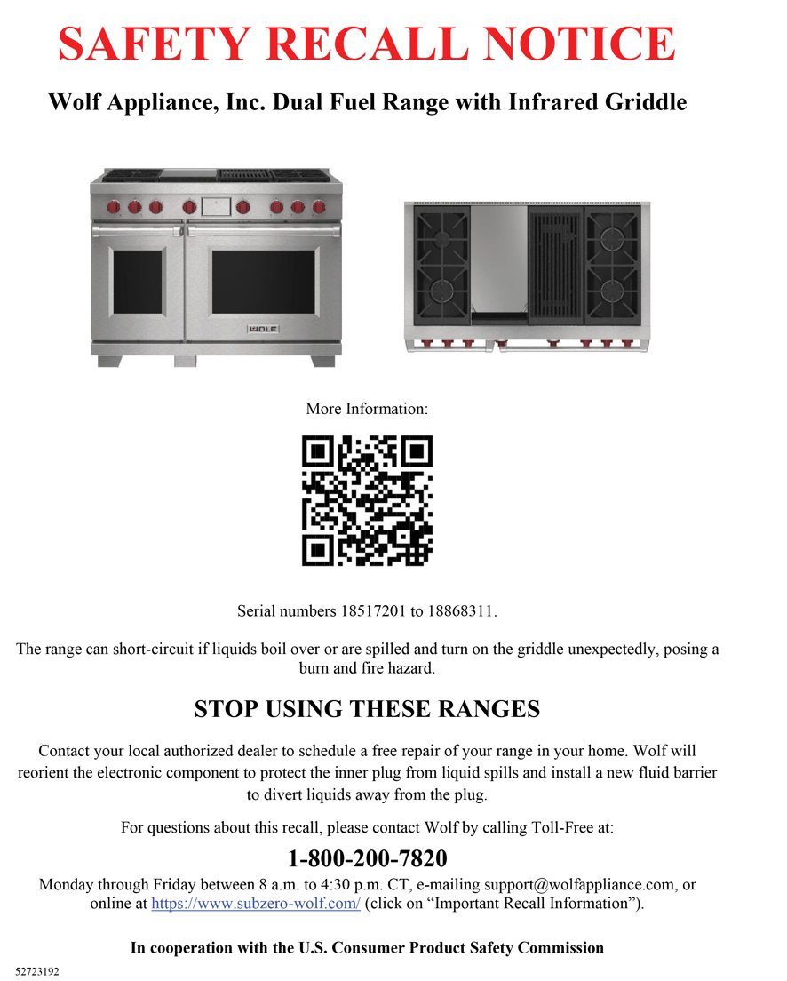 Wolf Recall Announcement - Dual Fuel Ranges with Griddles